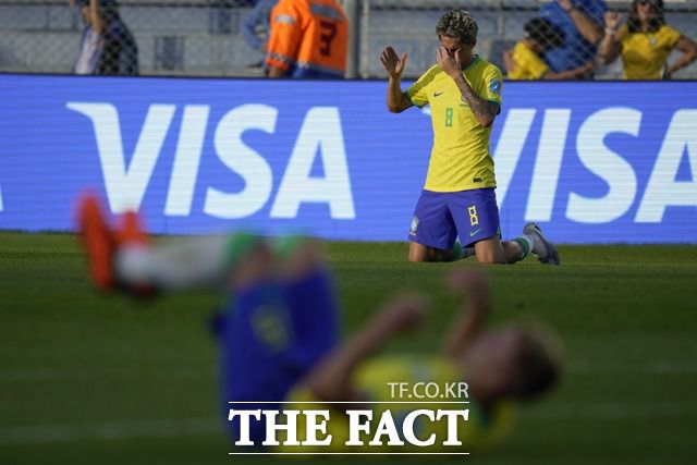 강력한 우승 후보 브라질 선수들이 4일 아르헨티나 산 후안에서 열린 2023 FIFA U-20 월드컵 8강전에서 이스라엘과 연장 혈투 끝에 3-2로 패하자 슬픔을 감추지 못 하고 있다./산 후안(아르헨티나)=AP.뉴시스 |