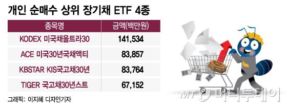 이는 개인이 올 들어 코스피 시장에서 순매수한 ETF 가운데 각각 3위, 10위, 11위, 12위에 해당되는 규모다. KODEX 미국채울트라30년선물(H)와 ACE 미국30년국채액티브(H)는 미국 국채 30년물에, KBSTAR KIS국고채30년Enhanced와 TIGER 국고채30년스트립액티브는 한국 국고채 30년물에 각각 투자하는 상품이다.