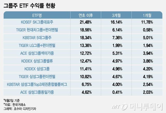 이외에 그룹주 ETF 수익률을 살펴보면 △'TIGER 현대차그룹+펀더멘털' 18.56% △'KBSTAR 5대그룹주' 18.34% △'TIGER LG그룹+펀더멘털' 13.36% △'ACE 삼성그룹섹터가중' 12.72% △'KODEX 삼성그룹밸류' 12.47% 순이었다.