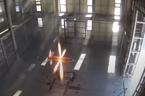 장거리 대공미사일(L-SAM) 요격체의 지상부유 시험 장면. 요격체의 자유로운 위치 및 방향 전환 능력을 지상에서 시험하는 것으로 높은 고도에서 적 탄도미사일을 요격하는 데 필수적인 시험이다. /국방과학연구소 영상 캡처