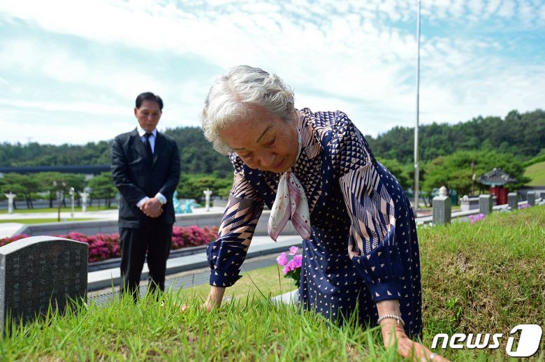 (광주=뉴스1) 이승현 기자 = 임성록 특전사동지회 고문(오른쪽)과 5·18희생자 유족 임근단 여사(가운데)가 4일 오후 광주 북구 운정동 국립 5·18민주묘지를 찾아 임 여사 아들인 고 김경철 열사 묘역에서 참배하고 있다. 두 사람은 전날 시민단체의 반발로 민주의문 앞에서 묵념을 올리는 것으로 참배를 대신했다. 2023.6.4/뉴스1 2023.6.4/뉴스1
