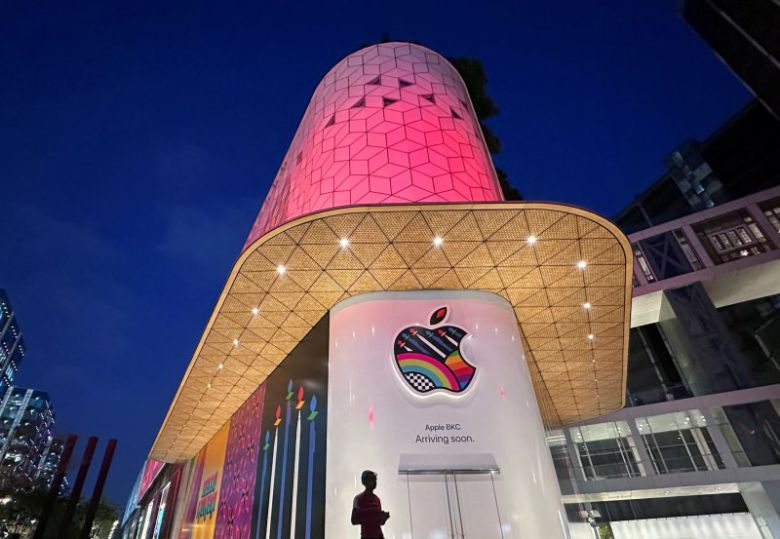 지난 5일(현지시간) 인도 뭄바이 복합쇼핑몰 '지오 월드 드라이브 몰'에 애플 스토어 인도 1호점이 외관 단장을 마친 모습. /사진=로이터 뉴스1 |