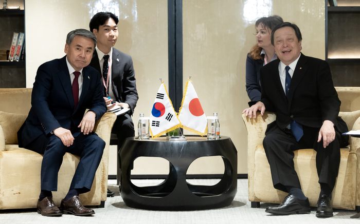 제20차 아시아안보회의(샹그릴라 대화)에 참석 중인 이종섭 국방부 장관이 4일(현지시간) 싱가포르 샹그릴라 호텔에서 하마다 야스카즈 일본 방위상과 양자회담을 하고 있다. 연합뉴스 |