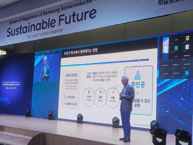 경계현 삼성전자 DS부문장(사장)이 지난달 4일 카이스트에서 '꿈과 행복의 삼성반도체: 지속가능한 미래'를 주제로 강연하고 있다. /제공=삼성전자