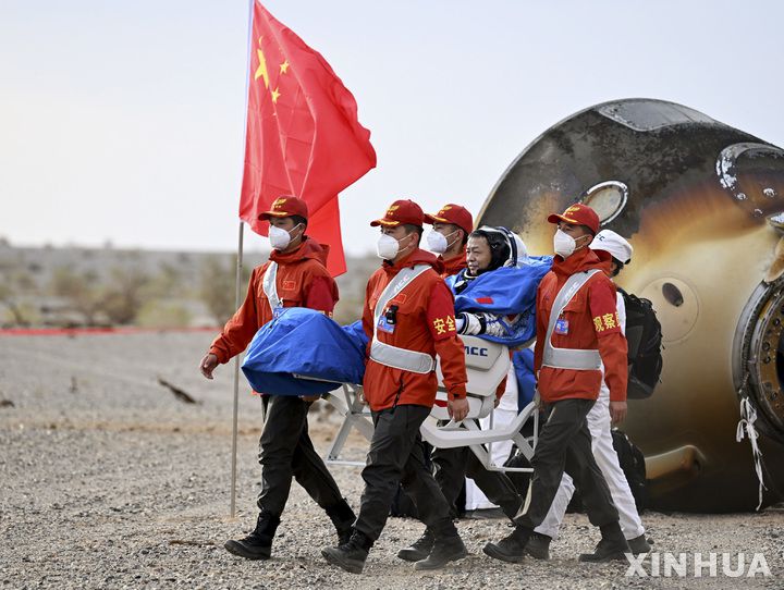 [서울=뉴시스] 권성근 기자 = 중국의 유인 우주선 선저우 15호를 타고 우주에 갔던 우주비행사 3명이 6개월 간의 우주정거장 임무를 마치고 지구로 귀환했다.