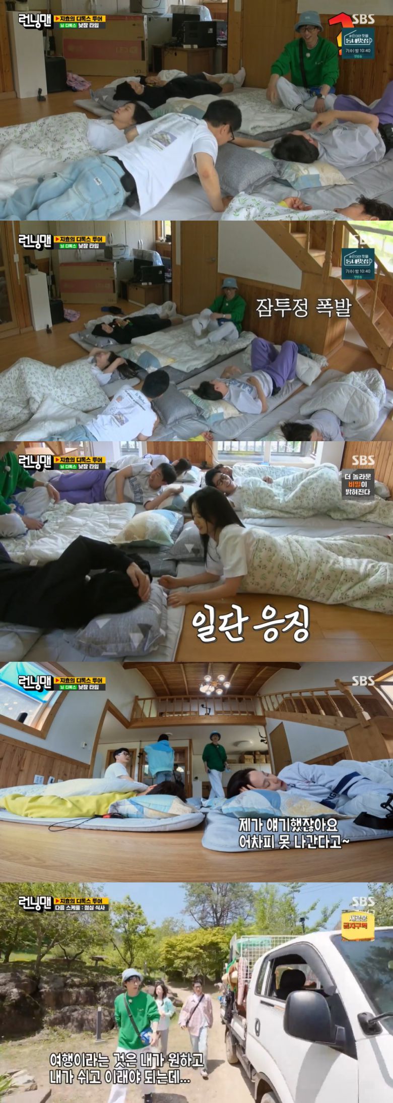 유재석은 "여기 있다가는 미쳐버리겠다"며 양세찬을 꼬셔서 장을 봐오겠다고 했다. 그런데 문이 잠겨있었다. 테라스를 통해 나가려고 시도했다. 지석진은 "내가 안 나가는 거랑 못 나가는 건 다르다"며 답답해했다. 지석진과 유재석은 "이렇게 거지 같은 여행은 처음이다"라며 불평했다. 송지효는 노트를 꺼내서 '거지 같은 여행'이라고 한 지석진의 이름을 적었다.