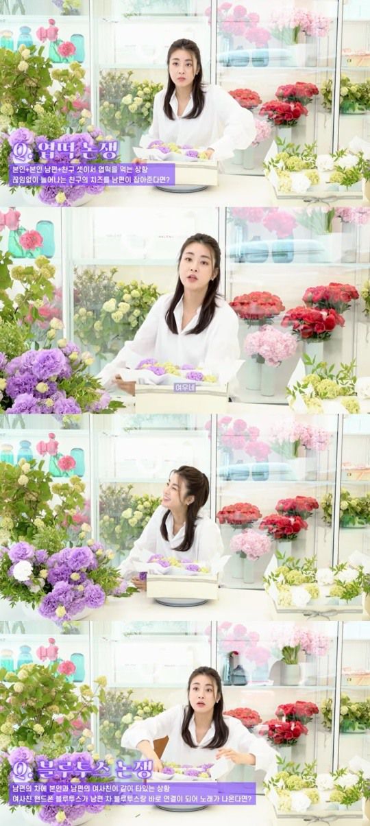 여사친 휴대폰 블루투스에 남편 차 블루투스가 바로 연결이 되어 노래가 나오는 '블루투스 논쟁'에 대해 강소라는 "그게 제일 싫다"고 단호하게 말했다. 질문을 이해한 뒤 꽃을 거칠게 꽂고 말을 더듬던 강소라는 "안된다. 왜들 그러나. 임자 있으면 알아서 조심해야 한다. 애초에 물어볼 여지가 없게 만들어야 한다. 신경 안쓰게"라고 강조해 웃음을 안겼다.