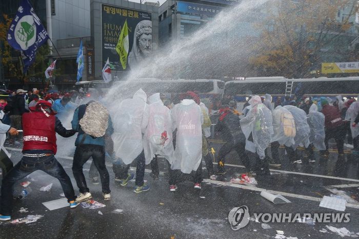 2015년 11월 서울 광화문 사거리 인근에서 열린 ‘민중총궐기 투쟁대회’에서 시위대를 향해 물대포를 발사하고 있는 경찰. [사진 = 연합뉴스]