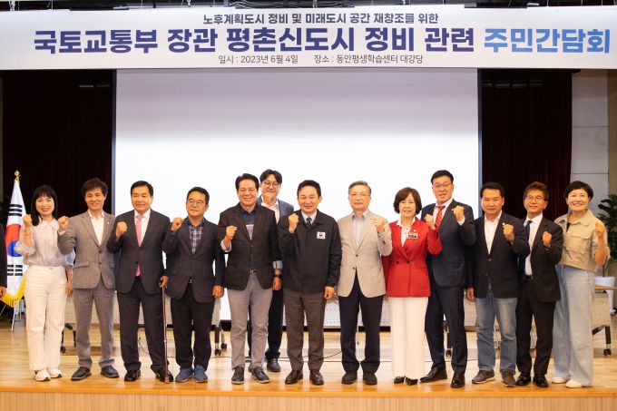 원희룡 국토부 장관이 4일 경기도 안양시 평촌에서 열린 노후계획도시 정비 관련 주민간담회에서 기념촬영하고 있다. [사진=국토교통부] |