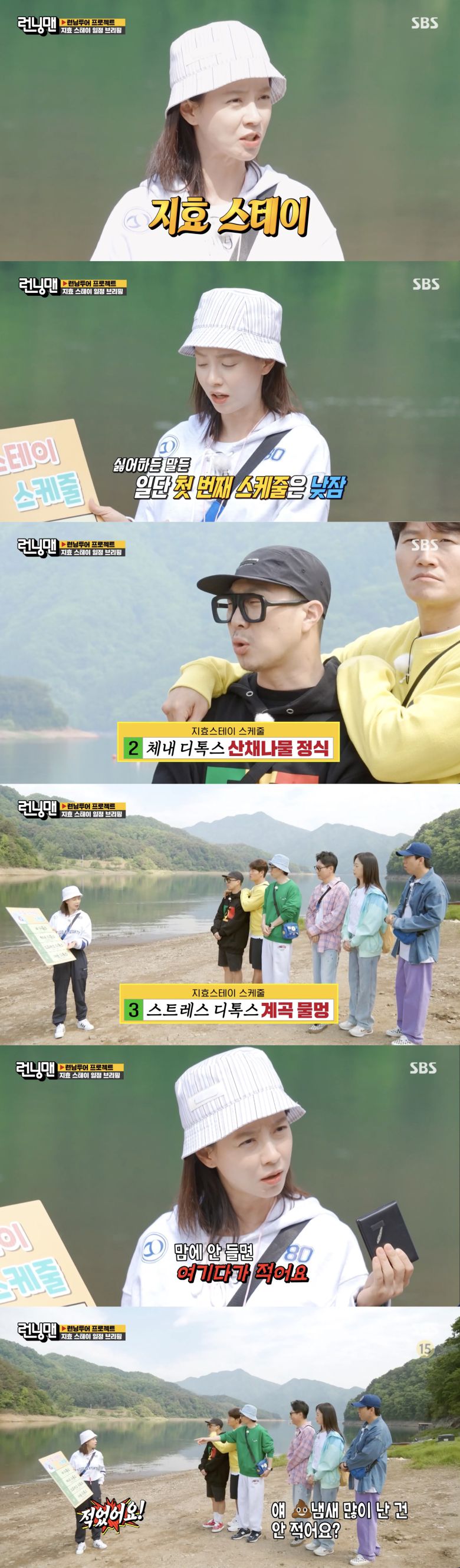 또한 송지효는 늘 인스턴트와 자극적인 음식을 먹는 멤버들을 위해 산채나물 정식으로 체내 디톡스를 할 것이라고 밝혔다. 그리고 마지막으로 스트레스를 날리기 위해 흐르는 계곡을 바라보며 멍 때리는 시간을 가질 것이라고 일정을 소개해 눈길을 끌었다.