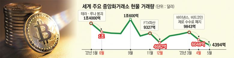 지난 1년간 바이낸스, 업비트, 오케이엑스, 후오비, 코인베이스를 포함한 38개 전세계 중앙화 거래소의 현물 거래량은 지난해 6월과 12월, 올해 4월에 급격한 감소를 보였다. 이는 각각 지난해 5월 초 테라루나 붕괴, 지난해 11월 초 FTX 파산, 올해 3월 바이낸스의 비트코인 거래 제로 수수료 정책 종료 시기와 맞물려있다. 테라루나·FTX 사태 때는 가상자산 시장 전체가 휘청였으며, 바이낸스가 제로 수수료 정책을 3월 종료하면서 4월 비트코인 현물 거래량은 65% 이상 감소한 바 있다.