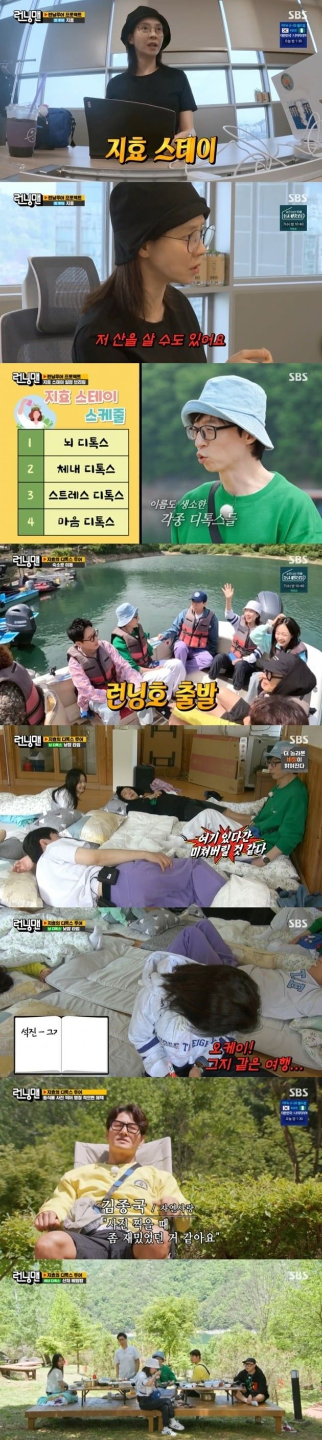 이날 방송은 앞서 예고된 대로 ‘2023 런닝투어 프로젝트’의 서막을 알리며 송지효의 ‘디톡스 투어’가 진행됐다. 송지효는 사전 회의에서 “콘셉트는 ‘지효 스테이’다. 항상 휴대폰을 달고 사는 멤버들을 위해 네트워크와 단절된 시간을 가지면 좋을 것 같다”며 자연 힐링여행을 강조했다.