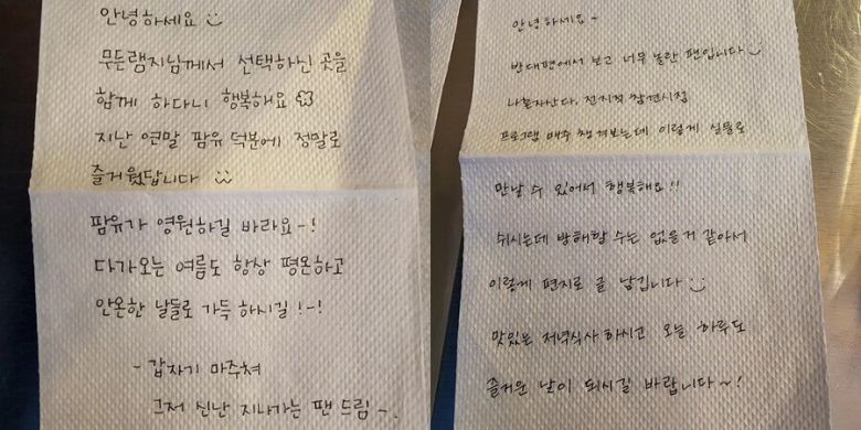 또 다른 팬은 "안녕하세요. 반대편에서 보고 너무 놀란 팬입니다. '나 혼자 산다', '전지적 참견시점' 프로그램 매주 챙겨보는데 이렇게 실물로 만날 수 있어서 행복해요! 쉬시는데 방해할 수는 없을 거 같아서 이렇게 편지로 글 남깁니다. 맛있는 저녁식사 하시고 오늘 하루도 즐거운 날이 되시길 바랍니다"라고 썼다.