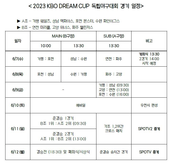 KBO (총재 허구연)는 "오는 7일(수)부터 강원도 횡성군에서 '2023 KBO DREAM CUP 독립야구대회'를 개최한다"고 밝혔다.