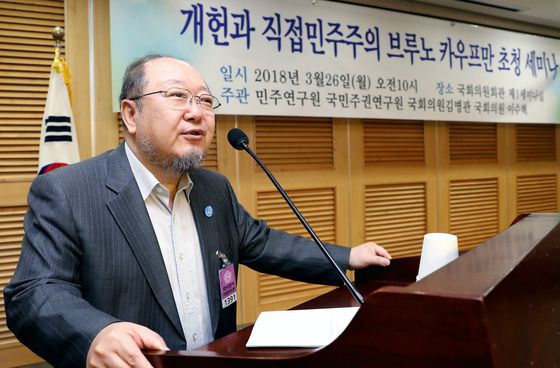 = 이래경 국민주권연구원 상임이사가 26일 오전 서울 여의도 국회 의원회관에서 열린 개헌과 직접민주주의 브루노 카우프만 초청 세미나에서 인사말을 하고 있다. 2018.3.26/뉴스1