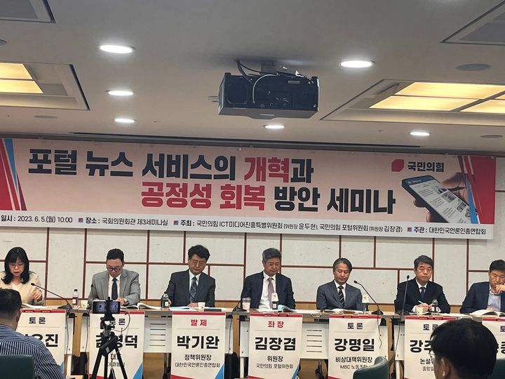이날 세미나는 김장겸 국민의힘 포털위원회 위원장이 좌장을 맡고, 강주안 중앙일보 논설위원·김유진 대안연대 사무총장·김영덕 더 퍼블릭 대표·강명일 MBC 노동조합 강명일·송종문 전 KBS 디지털뉴스국장이 토론에 참여했다.