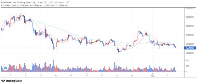 5일 오후 1시 39분 빗썸에서 국내 비트코인(BTC)은 전일 대비 1.00% 하락한 3554만 8000원에 거래 중이다. 이더리움(ETH)은 전일대비 1.35% 하락한 247만 9000원이다. 바이낸스코인(BNB)은 1.70% 하락한 39만 8600원, 리플(XRP)은 0.89% 상승한 705.5원에 거래됐다. 에이다(ADA)는 497.3원이다.