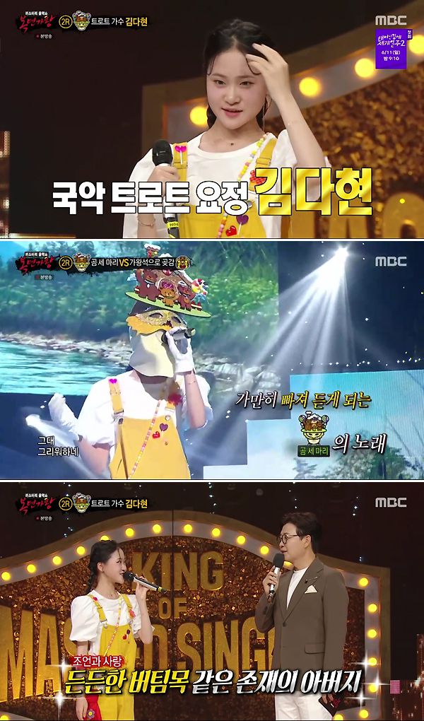 4일 방송된 MBC ‘복면가왕’에서 ‘가왕석으로 곶감’과 대결을 펼친 곰 세 마리의 정체가 김다현으로 밝혀지며 시선을 사로잡았다.