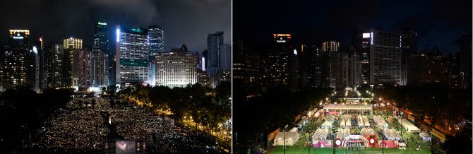 2019년 6월 4일 홍콩 빅토리아 공원에서 열린 톈안먼 사태 추모 행사(왼쪽)과 2023년 6월 4일 빅토리아 파크 모습 (사진=AFP)