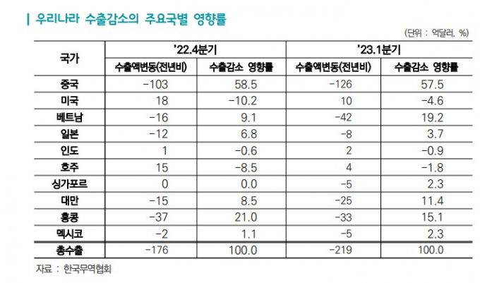품목별로는 '반도체'가, 국가별로는 '중국'이 수출 부진을 이끌었다. 올해 총수출 감소에서 반도체가 차지하는 비중은 60.4%(4월 기준)였고, 중국의 비중은 57.5%(3월 기준)였다. 탈중국 현상이 수출처 다변화라는 긍정적 결과를 만들어냈지만, 한편으로는 총수출 감소라는 악영향도 야기한 셈이다.