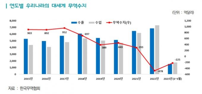 문제는 전체 수출 규모가 줄고 있다는 점이다. 수출은 올해 △1월 -16.4% △2월 -7.6% △3월 -13.6% △4월 -14.3% △5월 -16.1%(20일 기준) 모두 '마이너스'를 보였을 정도로 부진하다. 이에 따라 올해 무역수지 적자는 295억 달러(약 39조원)에 달하고 있다. 지난해 전체 무역수지 적자가 478억 달러(약 62조원)였다.