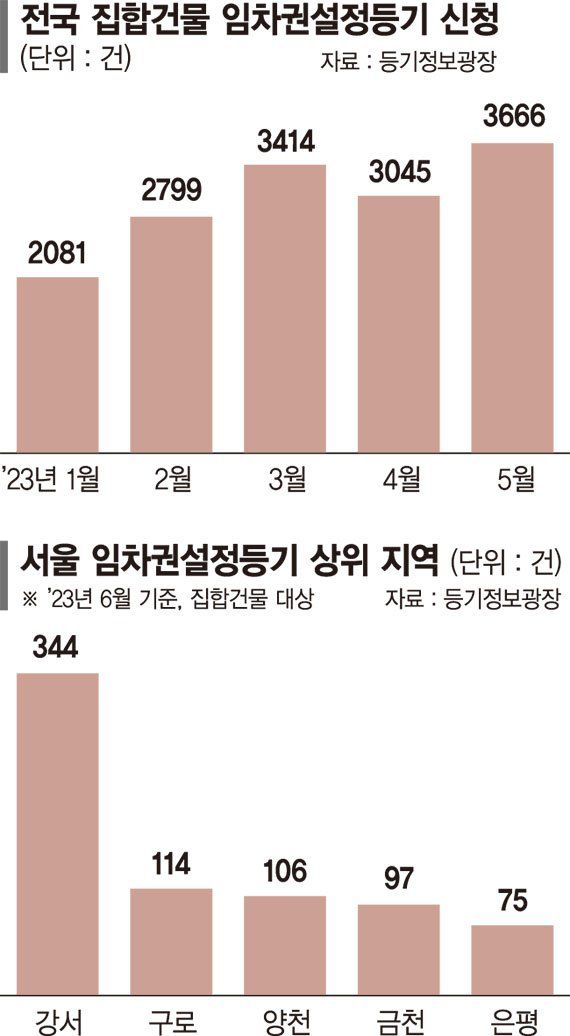 5일 대법원 등기정보광장에 따르면 5월 전국 집합건물의 임차권설정등기 신청건수는 이날 현재 3666건으로 전월(3045건)보다 20.3% 늘어난 역대 최대치다. 임차권설정등기 건수는 지난 3월 3414건으로 역대 최대치를 경신한 후 4월 3045건, 5월 3666건 등 매달 3000건을 웃돌고 있다.