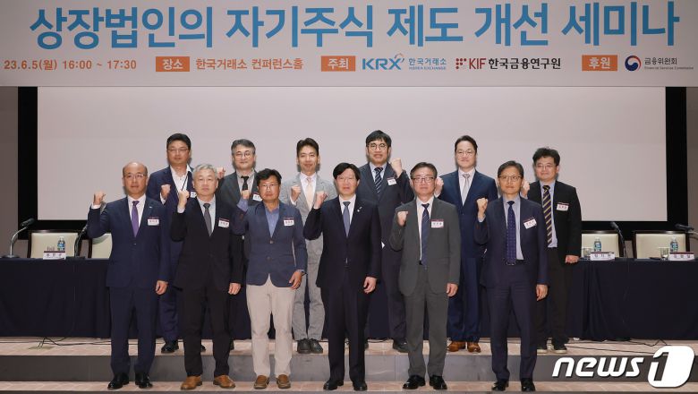 김소영 금융위원회 부위원장(앞줄 오른쪽 세 번째)이 5일 오후 서울 여의도 한국거래소 컨퍼런스홀에서 열린 상장법인 자기주식 제도 개선 세미나에서 참석자들과 파이팅을 외치고 있다. (금융위원회 제공) 2023.6.5/뉴스1