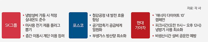 SK그룹은 시설 관리 외 생활 속 전력 절감 실천 사항을 안내하고 있다. 혹서기 전력 사용량 폭증에 대비해 냉방 설비 가동 시 적정 실내온도 준수와 미사용 전기 제품 플러그 뽑기, 층간 이동 시 계단 이용 등을 장려하고 있다.