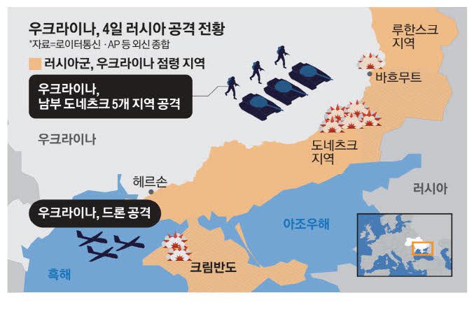 5일(현지시간) 스푸트니크통신, 타스통신 등에 따르면 러시아 국방부는 이날 성명을 통해 우크라이나 동부 도네츠크주 남부 지역에서 우크라이나군이 전날 2개 전차 대대와 6개 기계화 대대를 동원해 러시아 방어선을 공격했다고 밝혔다. 러시아 국방부는 "우크라이나군이 남부 전선 5개 구역에서 대규모 공세를 감행했다"며 "이들의 목적은 본인들이 생각했을 때 전선의 가장 취약한 부분을 돌파하는 것이었다"고 설명했다.