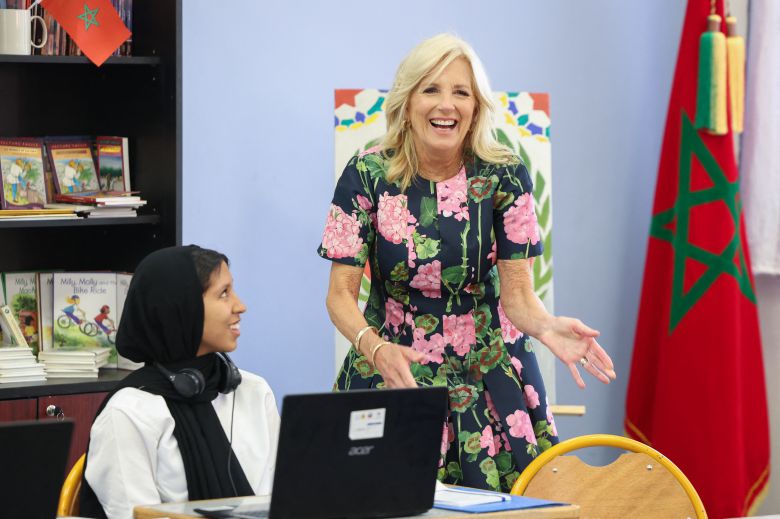 바이든 여사는 5일 모로코 마라케시의 이븐 알 아리프 학교를 찾았다. 이 학교는 미국 정부가 모로코 정부와 손잡고 만든 중등 교육 프로젝트가 적용된 학교다. 그는 이 학교 학생들과 대화를 나누고 참관수업을 하면서 연분홍색 꽃과 녹색 잎이 그려진 원피스를 착용했다.