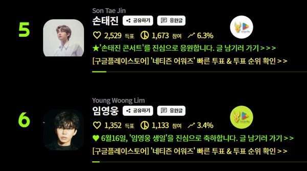 6일 오전 1시 11분 기준 남자가수상에서 손태진은 2529득표로 5위, 임영웅은 1352득표로 6위에 각각 랭크돼있다. 두 스타는 이제 오디션판의 '신'과 '구'를 상징한다고 할 수 있다. 팬들은 '내 스타가 최고'라는 마음으로 투표에 임하고 있다.