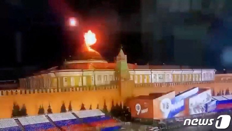 3일(현지시간) 러시아 모스크바에 있는 크렘린 상원 건물 위쪽에서 비행 물체가 폭발하는 모습이다. 블라디미르 푸틴 대통령의 집무실은 이 상원 건물에 있다. 이날 러시아 당국은 우크라이나가 무인항공기(드론) 2대로 러시아 크렘린궁 공격을 시도했다고 주장했다. ⓒ 로이터=뉴스1 ⓒ News1 최종일 기자