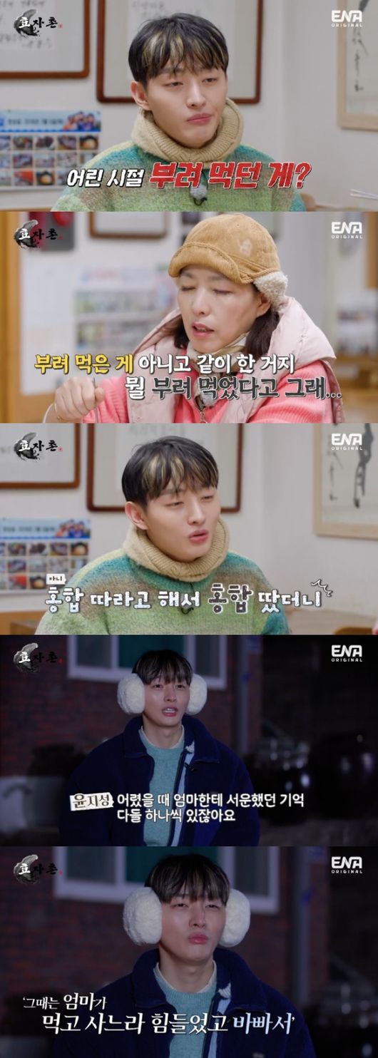 윤지성 모자는 홀가분한 마음으로 식사를 하러 나섰다. 윤지성은 “효자촌에 와서 타율이 좋은 것 같다”라고 만족감을 드러냈다. 윤지성의 어머니는 “유치하게 보였던 부분이 해보니까 재밌다. 막대과자를 물었을 때 장사할 때 너네 업고 했던 기억도 났다”라고 사소한 게임 하나도 남다르게 느껴졌던 감정을 전했다. 훈훈한 분위기 속에서 윤지성은 “어린 시절 부려먹던 게?”라고 말했고 어머니는 “부려 먹은 게 아니고 같이 한 것이다. 뭘 부려 먹었다고 그러냐”라고 민망해했다. 윤지성은 “추운 겨울에 홍합 땄다. 냄새가 안 빠지더라”라고 어린 시절을 떠올렸고 어머니는 “좋은 것 좀 생각해라. 원망스럽냐”라고 말을 끊었다.