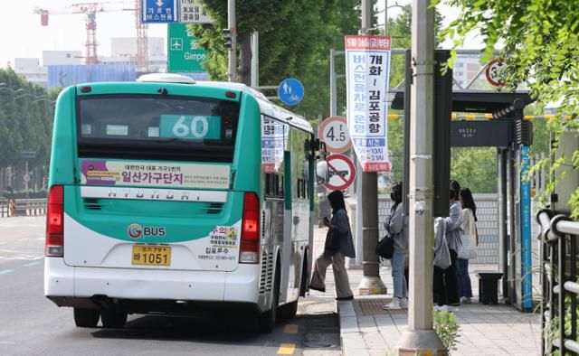 지난달 26일 서울 강서구 지하철 9호선 개화역 인근 버스정류소에서 출근길 시민들이 버스에 탑승하고 있다. 연합뉴스