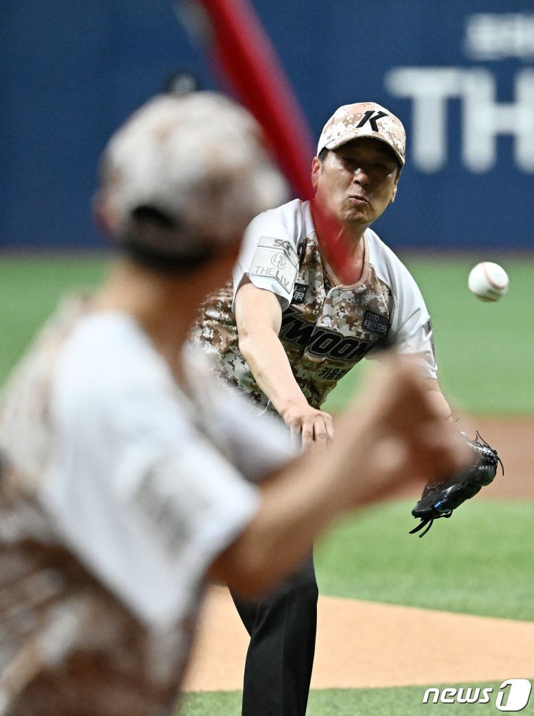 (서울=뉴스1) 김진환 기자 = 6일 오후 서울 구로구 고척 스카이돔에서 열린 프로야구 '2023 신한은행 SOL KBO리그' LG 트윈스와 키움 히어로즈 경기를 앞두고 한국전쟁 전사자 故 이승옥 이등중사의 유가족 이천수씨가 시구를 하고 있다. 2023.6.6/뉴스1