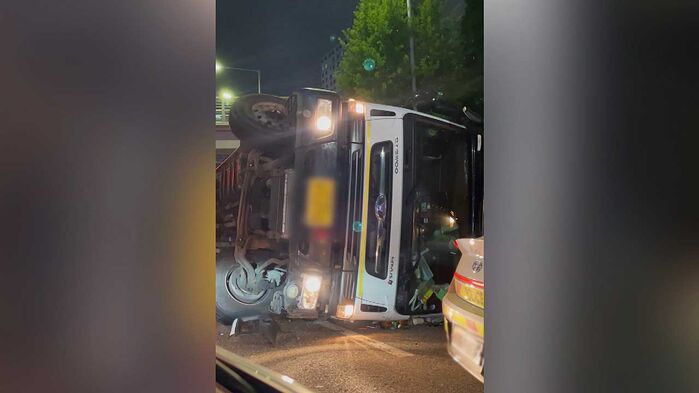 [김나영/목격자 : 일단 트럭은 뒤집혀 있었는데, 길을 아예 역주행 방향으로 뒤집혀 있는 상태여서. 차 한 대는 인도 나무 쪽에 박혀 있었고….]