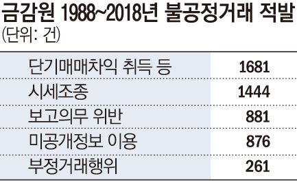 금융감독원에 따르면 1988년부터 2018년까지 과거 30년간 적발된 불공정거래 건수는 총 5143건에 달한다. 이 중 3대 주요 불공정거래(시세조종행위, 미공개정보이용행위, 부정거래행위)로 분류되는 사건만 해도 2581건(50.2%)이었다.