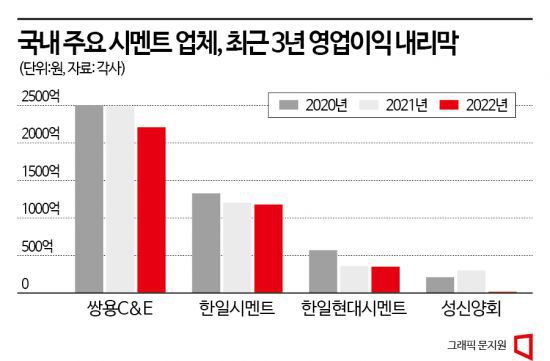 다른 경쟁 업체들의 상황도 별반 다르지 않다. 최근 1년 새 한일시멘트 주가는 1만8800원에서 1만2990원으로 약 31% 내려앉았고, 한일현대시멘트도 2만9750원에서 1만7840원으로 40% 떨어졌다. 두 기업의 최근 3년 영업이익 역시 감소 추세다.