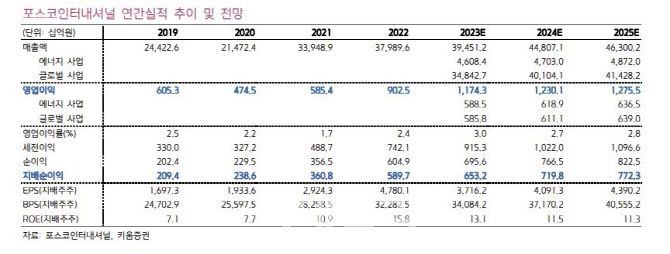 특히 포스코인터내셔널은 올해 포스코에너지를 합병하면서 분기평균 영업이익 레벨이 기존 1500억~2000억원 수준에서 올해 상반기 3000억원 수준으로 상승했고, 4월부터 꾸준한 주가상승으로 시가총액도 5조원대로 상승해 5월에는 MSCI 한국 지수에 편입되는 등 합병 이후 시장의 평가는 매우 긍정적이라는 것이 이 연구원의 설명이다.