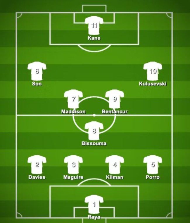 쓰리톱은 손흥민, 해리 케인, 데얀 쿨루셉스키였고 중원은 제임스 메디슨, 이브 비수마, 로드리고 벤탄쿠르가 이름을 올렸다. 4백은 벤 데비이스, 해리 매과이어, 막시밀리안 킬먼, 페드로 포로가 짝을 이뤘으며 골키퍼 장갑은 다비드 라야의 몫이었다.