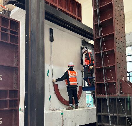 DL이앤씨 직원들이 수직증축 리모델링의 안전성 문제를 해결할 수 있는 ‘포스트텐션(Post-Tension) 하중전이공법’을 국내 건설업계 최초로 개발해 검증하고 있다. /사진제공=DL이앤씨 |