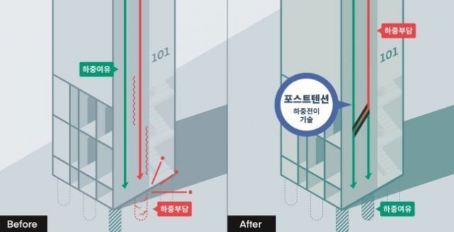 층수를 올릴 때 일부 파일에 집중되는 하중을 분산하기 위해 DL이앤씨는 포스트텐션 기술을 활용하는 아이디어를 떠올렸다. 포스트텐션 공법은 강연선의 긴장력을 이용해 건물의 슬래브나 교량의 하중을 지지하는 기술로 초고층 빌딩이나 원자력발전소, 교량 건설 등에 사용된다.