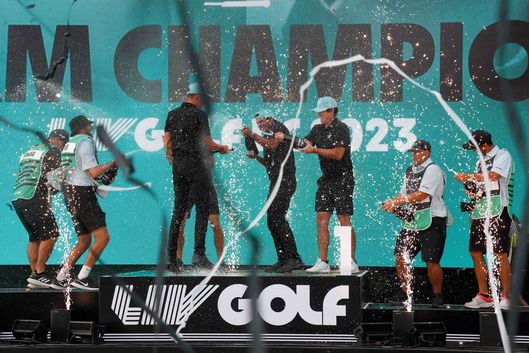 2023년 5월 28일 미국 버지니아주 포토맥폴스 트럼프 내셔널에서 열린 LIV 골프 워싱턴 D.C. 골프 토너먼트에서 팀 우승을 차지한 선수들이 시상대에 올라 축하하고 있다./USA투데이스포츠 연합뉴스 |