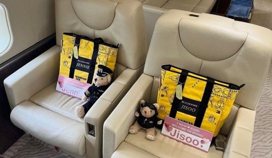 대한항공이 공개한 전용기 내부 사진에는 블랙핑크 멤버들의 이름이 새겨진 노란색 가방과 인형이 자리마다 놓여있다. 멤버들의 특징에 따라 각각 다른 인형의 모습이 눈길을 끈다. 또 다른 사진에는 고급스러운 탁자와 소파가 담겼다.