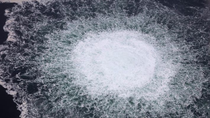 2022년 9월 28일(현지시간) 발트해 스웨덴의 배타적경제수역(EEZ)에 있는 노르트스트림-1 가스관에서 가스가 바다 표면으로 유출되는 모습. 연합뉴스