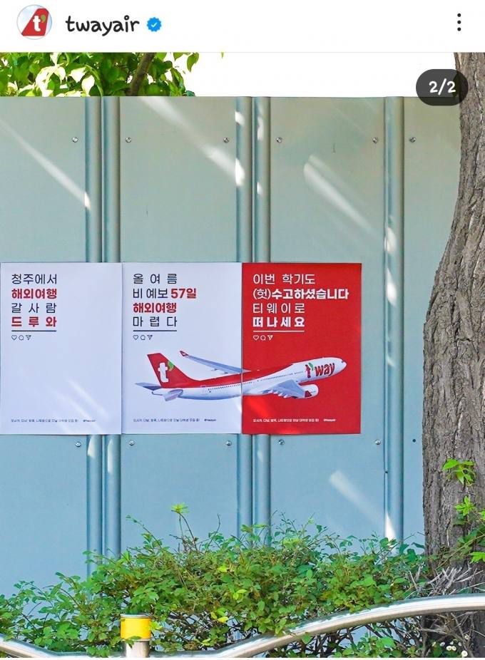 티웨이항공은 각기 다른 세 장의 포스터를 통해 이 같은 이벤트 내용을 홍보했다. 포스터에는 각각 ‘청주에서 해외여행 갈 사람 드루와’ ‘올여름 비 예보 57일 해외여행 마렵다’ ‘이번 학기도 (헛)수고하셨습니다 티웨이로 떠나세요’라는 문구가 담겼다.