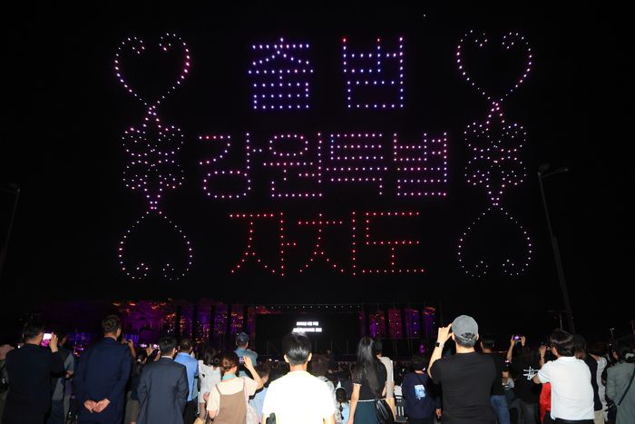 지난 3일 강릉시 올림픽파크에서 ‘강원특별자치도’ 출범을 기념하는 드론쇼가 펼쳐지고 있다. 강릉시 제공 |