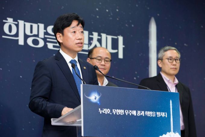 오태석 과학기술정보통신부 제1차관이 지난달 24일 오후 전라남도 고흥군 나로우주센터 프레스룸에서 '누리호 3차 발사 일정 조정' 관련 브리핑을 하고 있다. 오 차관은 7일 정부세종청사에서 미디어데이를 열고 '과학기술 분야 국제협력 진행상황'을 공유했다. / 사진=과학기술정보통신부