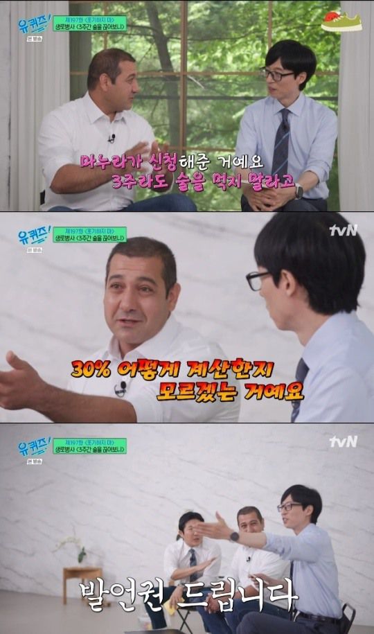 7일 밤 방송된 tvN예능프로그램 ‘유 퀴즈 온 더 블럭’에서는 ‘생로병사의 비밀-3주간 술을 끊어보니’ 편에 출연해 화제가 된 카리미 안왈 씨와의 토크가 전파를 탔다.