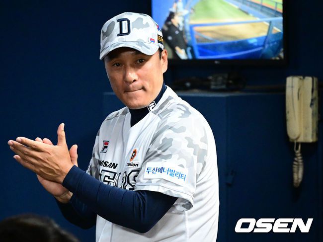 7회말 2사 2,3루 두산 양석환이 투수 맞고 중전으로 향하는 역전 2타점 적시타를 날리자 이승엽 감독이 기뻐하고 있다. 023.06.07 /cej@osen.co.kr